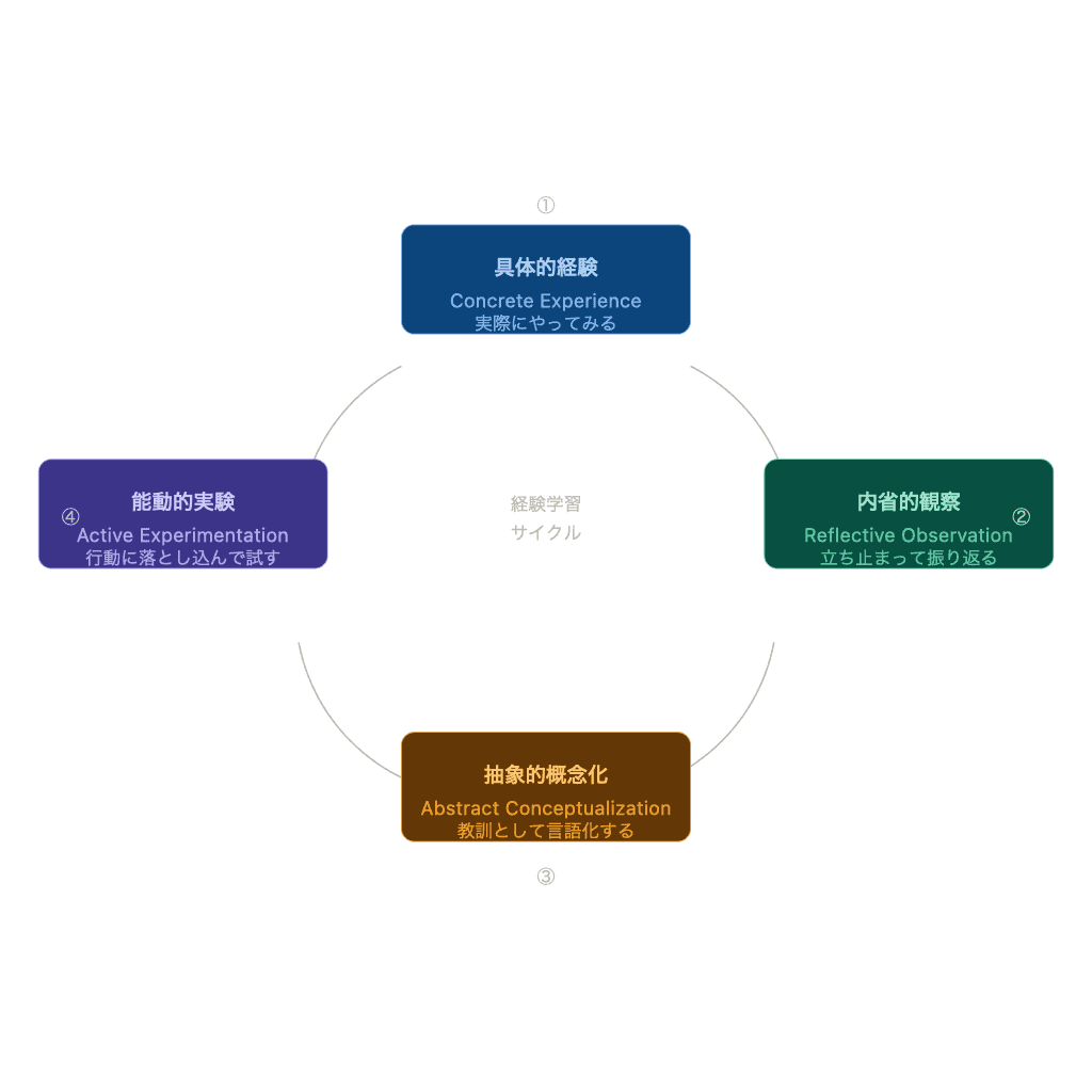 最初のステージは具体的経験(Concrete Experience)で、実際に何かをやってみることだ。次に内省的観察(Reflective Observation)、起きたことを立ち止まって振り返り、観察する段階になる。そこから抽象的概念化(Abstract Conceptualization)へと進む。振り返りを通じて得た気づきを、次にも使える教訓や原則として言語化するフェーズだ。最後が能動的実験(Active Experimentation)で、概念化した学びを実際の行動に落とし込んで試してみる。